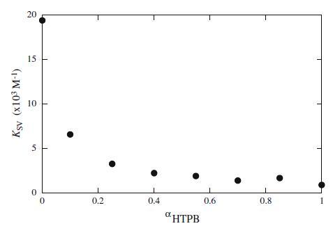 KSV值根據(jù)公式20(數(shù)據(jù)未顯示)的斜率進行評估,如圖6所示。圖6顯示KSV的值隨著HTPB成分含量的增加而降低,反映出熒光團變得更難接近猝滅劑。據(jù)報道,隨著陽離子gemini表面活性劑摩爾組成的增加,KSV降低[24]。