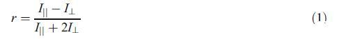 所有熒光各向異性測量均在25.0±0.2°C下使用來自美國的熒光偏振儀器系統(tǒng)(Beacon-2000)進行。該儀器配備了100W鹵素?zé)糇鳛榧ぐl(fā)源。羅丹明B(RB)作為熒光探針,其濃度保持在1μM。我們還在12mM純表面活性劑濃度下進行了10 nM至2μM探針濃度的各向異性測量(數(shù)據(jù)未顯示)。選擇飽和r值(探針完全與膠束結(jié)合)下的探針濃度(1μM)作為實驗條件。純和二元混合物的表面活性劑總濃度為12mM。分別使用570和630nm的激發(fā)和發(fā)射波長測量熒光各向異性。當(dāng)發(fā)射偏振器平行或垂直于偏振激發(fā)方向定向時?,分別地各向異性是強度差I(lǐng)kI的比率?總強度Ikt2I?如等式1所示: