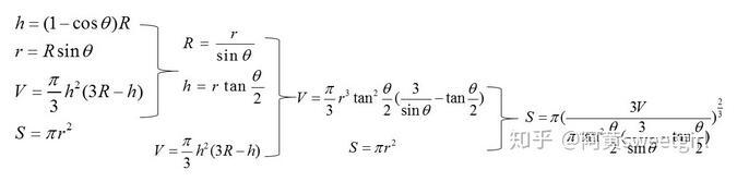 此時(shí)根據(jù)球的體積公式,以及簡(jiǎn)單的三角函數(shù)變換,就可以得出S與V和θ的關(guān)系,具體推導(dǎo)過程如圖2所示。
