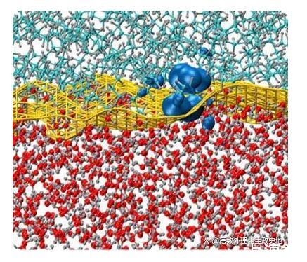 大多數(shù)DFT模擬的計算要求通常與電子數(shù)的立方成比例。但對于具有大帶隙特性的絕緣系統(tǒng),僅線性擴(kuò)展的DFT技術(shù)可用于研究電子結(jié)構(gòu)。利用這種方法,哈桑納利和他的同事在納米尺度上模擬了由數(shù)千個原子組成的疏水界面的電子效應(yīng)。下圖顯示了模擬的油水界面。