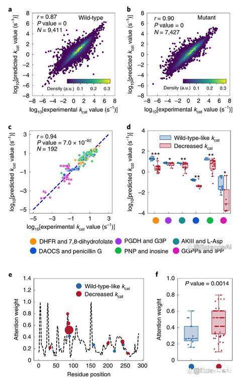 DLKcat可以捕獲kcat向精確的單個氨基酸替代方向的變化,從而能夠計算注意力權重,從而識別對酶活性產生重大影響的氨基酸殘基。氨基酸取代是酶進化領域的一項強大技術,通常用于探測酶催化機制。特別是,大多數替代實驗在底物結合位點區(qū)域進行誘變,因為假設結合區(qū)域將對催化活性產生很大影響。然而,據報道,偏遠地區(qū)會對催化活性產生深遠影響。