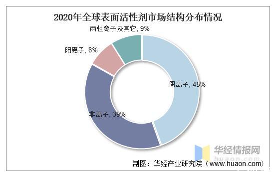 從市場(chǎng)結(jié)構(gòu)來(lái)看,2020年全球表面活性劑市場(chǎng)中,陰離子和非離子是其最主要的細(xì)分領(lǐng)域,占比分別為45%和39%,陽(yáng)離子和兩性離子及其它占比分別為8%和9%。
