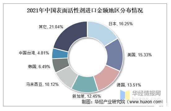 2021年中國(guó)表面活性劑進(jìn)口金額地區(qū)分布情況