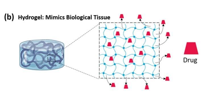 水凝膠是通過(guò)物理或化學(xué)交聯(lián)方法形成的三維聚合物網(wǎng)格。網(wǎng)格之間留有一定的空間,由于該網(wǎng)格的存在,水凝膠的結(jié)構(gòu)富含多孔性。聚合物網(wǎng)格可以截留大量的水,并防止其運(yùn)輸?shù)酵獠凯h(huán)境,從而模仿生物組織的物理特性。這種保水能力,使水凝膠能夠提供良好的生物相容性和封裝藥物分子的平臺(tái)。該網(wǎng)格可以限制不同酶的滲透,從而保護(hù)包封的藥物免受各種酶降解。