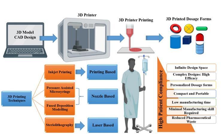 3D打印技術(shù)中不需要造粒、壓片以及包衣等環(huán)節(jié),并且可以靈活控制藥物的劑量以及釋放,所以該技術(shù)逐漸發(fā)展起來(lái)。3D打印技術(shù)主要有選擇性激光燒結(jié)(SLS)、光固化成型(SLA)、熔融沉積成型(FDM)、半固體擠出成型(SSE)以及噴墨成型打?。↖JP)等方式。3D打印藥物目前的代表藥物,為FDA批準(zhǔn)的Spritam。