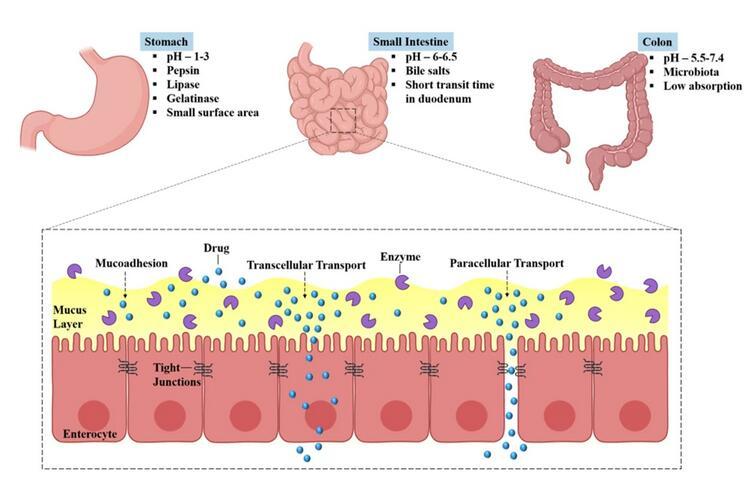口服藥物在經(jīng)歷胃部的生理障礙后到達(dá)小腸。在小腸(十二指腸)的入口處,胰酶會(huì)引發(fā)幾種酶促轉(zhuǎn)化,這些酶還可能導(dǎo)致首過(guò)代謝,從而導(dǎo)致藥物生物利用度降低。因此,口服藥物必須克服這些生理學(xué)障礙。