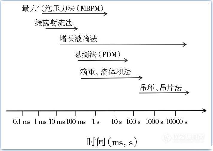 由于對DST時間范圍界定的不同,可運用的測量手段也有所不同。王建坤等認為,在達到靜態(tài)表面張力前的表面張力變化都可算是DST,這個時間范圍以幾毫秒到幾小時計??捎肳ilhelmy吊片法、DuNouy吊環(huán)法、滴重法、滴體積法、懸滴法、最大氣泡壓力法測定DST。