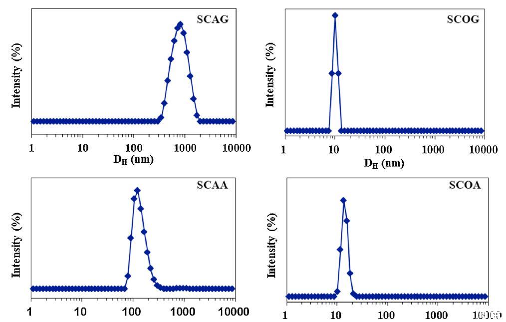 用DLS測(cè)量在6種?;被岜砻婊钚詣┧芤褐行纬傻木奂w的大小和分布,其CMC為5倍,5×CMC。圖2顯示了它們的表觀等效流體動(dòng)力學(xué)直徑(DH)。除絲氨酸外,蓖麻油表面活性劑的DH分布普遍大于棉籽油表面活性劑的DH分布。SCAG和SCAA的DH分布分別集中在900和150 nm,而SCOG和SCOA聚集體的直徑約為10 nm。對(duì)于絲氨酸,SCAS和SCOS的平均DH值分別約為100 nm和250 nm。這些結(jié)果可以通過蓖麻油衍生的表面活性劑的蓖麻油基和絲氨酸頭部基團(tuán)上都存在-OH基團(tuán)來解釋,促進(jìn)了大聚集體,例如囊泡的形成(圖2)。