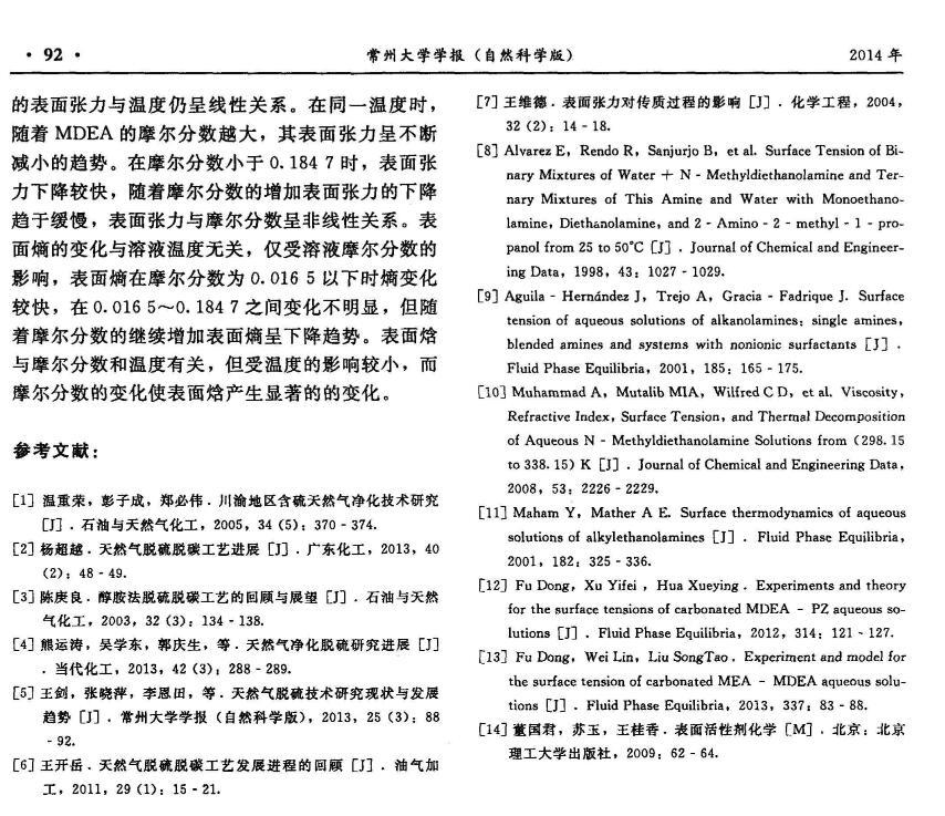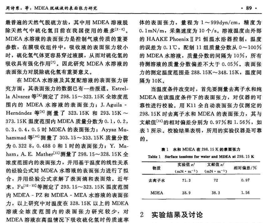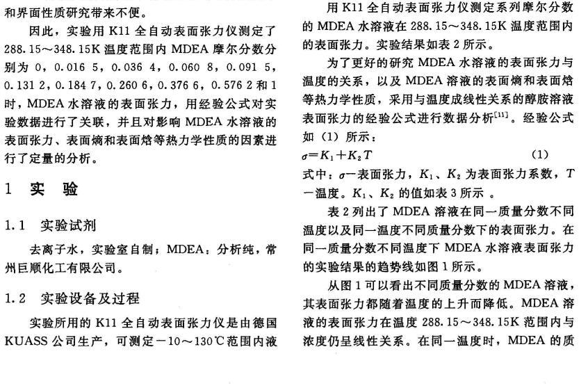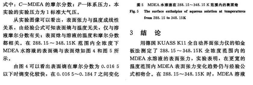 【摘要】:N-甲基二乙醇胺(MDEA)水溶液的表面張力是硫化氫醇胺吸收工藝的一個(gè)重要參數(shù)。用德國(guó)KUASS K11全自動(dòng)界面張力儀的鉑金板法測(cè)定了288.15~348.15K全濃度范圍內(nèi)的MDEA水溶液的表面張力,并用經(jīng)驗(yàn)公式對(duì)實(shí)驗(yàn)數(shù)據(jù)進(jìn)行了擬合,擬合曲線與實(shí)驗(yàn)值吻合良好。在此基礎(chǔ)上對(duì)MDEA的熱力學(xué)性質(zhì)(表面熵,表面焓)進(jìn)行了進(jìn)一步分析,結(jié)果表明,表面熵在摩爾分?jǐn)?shù)為0.016 5以下時(shí)熵變化較快,在0.016 5~0.184 7之間變化不明顯,但隨著摩爾分?jǐn)?shù)的繼續(xù)增加表面熵呈下降趨勢(shì)。表面焓在摩爾分?jǐn)?shù)為0.060 8以下和0.184 7~0.260 6之間變化較快,在0.060 8~0.184 7和0.260 6以上時(shí)焓變化趨于緩慢。