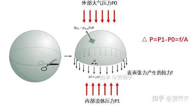 而這里有一件非常關(guān)鍵的事請(qǐng),就是由于表面張力的存在,彎曲的表面就會(huì)在兩側(cè)形成壓力差。就好像緊繃的氣球,其內(nèi)部壓力要高于外部的壓力。這種壓力差來自哪里?當(dāng)然就是氣球皮膜緊繃的張力。由于氣球的彎曲表面,使得其張力最終表現(xiàn)為內(nèi)部壓力的升高。