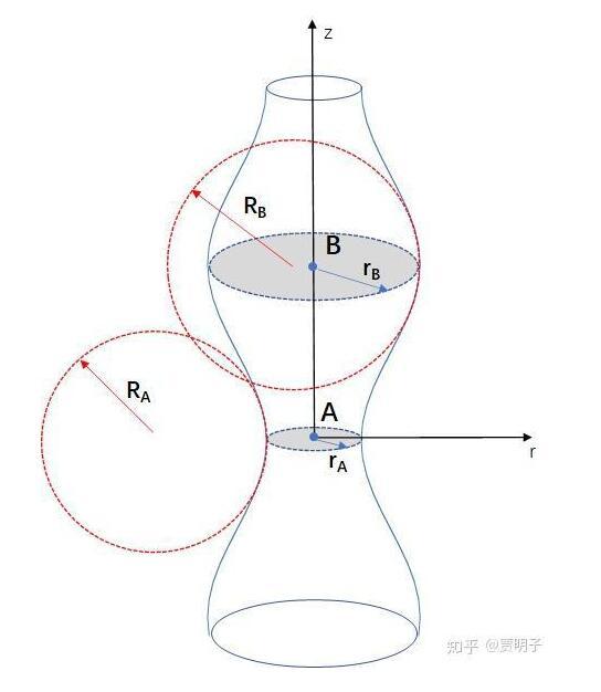 在A點(diǎn),z方向上產(chǎn)生了負(fù)曲率(半徑RA),而r方向上,由于半徑變小,曲率變大。也就是說,A點(diǎn)上的曲率變化產(chǎn)生了兩個(gè)效果: