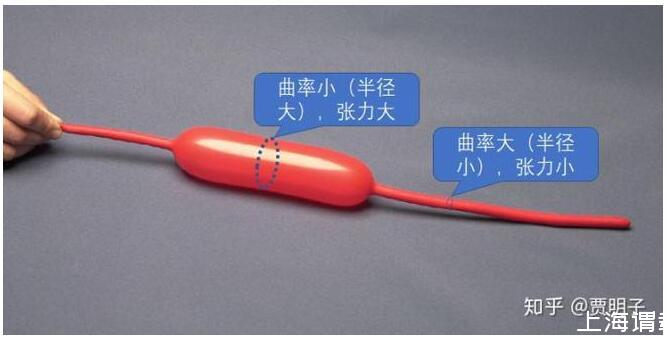 氣球內(nèi)部的氣體壓力處處相等,但是,接觸過這種氣球的人都有一個(gè)經(jīng)驗(yàn),就是粗的地方繃得緊,而細(xì)的地方繃得就不那么緊。如上圖所示,繃得緊的地方和繃得松的地方,產(chǎn)生的壓力差是相等的,但是他們的曲率是不相等的:曲率越大,同樣的張力所能產(chǎn)生的壓力差就更大。