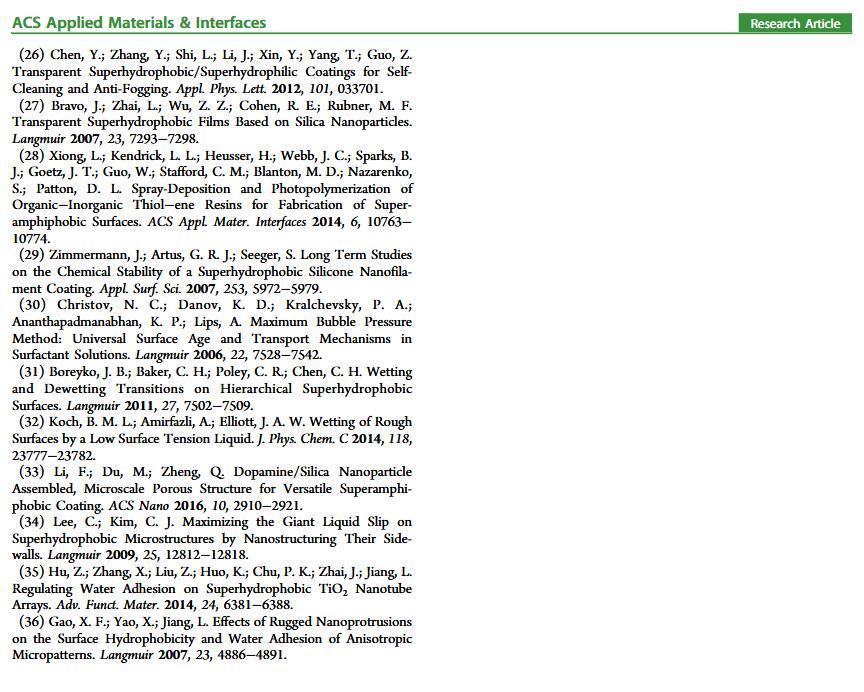 結(jié)果表明,以正硅酸四乙酯為前驅(qū)體通過酸性和堿性水解法制備了不同形貌的納米二氧化硅溶膠,通過混合兩種溶膠可制備出具有顆粒間鍵橋強度高的亞微米級凸起和納米級凹坑的結(jié)構(gòu)的涂層。通過控制酸堿催化溶膠混合比例,我們可以制備出具有不同微觀結(jié)構(gòu)的超疏水涂層。結(jié)果表明具有不同結(jié)構(gòu)的涂層具有不同的潤濕性-表面張力關(guān)系,隨著涂層制備時堿催化溶膠的比重增加,納米級凹坑結(jié)構(gòu)逐漸減少,表面更容易被低表面張力液體侵入,因而接觸角下降更劇烈。并且在有機物水溶液,包括:甲醇、乙醇、正丙醇、異丙醇、乙酸、丙酮、N,N’-二甲基酰胺等,都具有同樣的接觸角和濃度(表面張力)響應(yīng)規(guī)律。