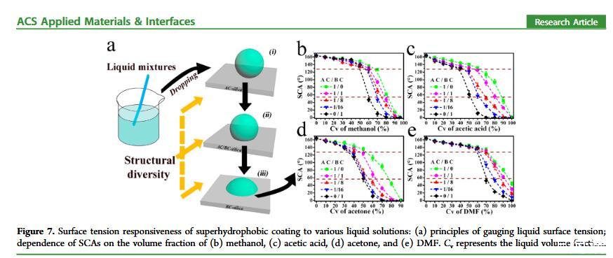 當液體的表面張力發(fā)生變化時,它在普通固體表面的潤濕性也會隨著變化。然而,關(guān)于這一規(guī)律以及尤其是在超疏水表面的表現(xiàn)的研究很少。最近,協(xié)同創(chuàng)新中心PI-6管自生老師課題組研究生王研等人利用上述的表面張力和潤濕性的響應(yīng)關(guān)系首次將透明超疏水涂層應(yīng)用在探測液體表面張力方面,為拓寬多功能超疏水涂層的應(yīng)用提供了一個新的思路,相關(guān)論文已被ACS applied materials&interfaces發(fā)表。研究表明,隨著有機物水溶液中有機物體積分數(shù)上升,溶液的表面張力相應(yīng)地下降,溶液液滴在制備的超疏水涂層的接觸角也逐漸下降,此稱之為表面潤濕性對表面張力的響應(yīng)。基于此響應(yīng)關(guān)系,可以通過接觸角估測液體的表面張力以及有機物的濃度。