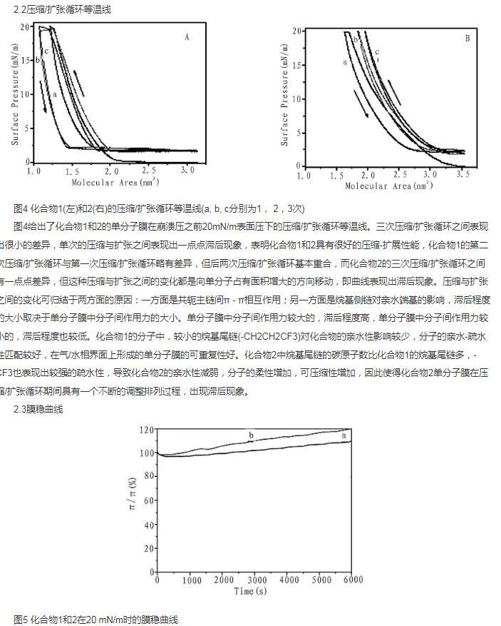 摘要:合成了雙頭基多氟烷基兩親杯芳烴化合物1和2,利用表面壓一面積(π-A)等溫線、壓縮/擴(kuò)張循環(huán)等溫線與膜穩(wěn)曲線研究了他們在空氣/水相界面的成膜性能,并用紫外光譜和原子力顯微鏡對組裝的LB膜進(jìn)行了結(jié)構(gòu)表征。結(jié)果表明:化合物1和2在空氣/水相表面均能很好的形成穩(wěn)定的Langmuir膜,取代基碳原子數(shù)的增加使得化合物2的Langmuir膜單分子面積增加,崩潰壓相應(yīng)減少,組裝的LB膜均為H-聚集體,結(jié)構(gòu)均勻,穩(wěn)定性好。