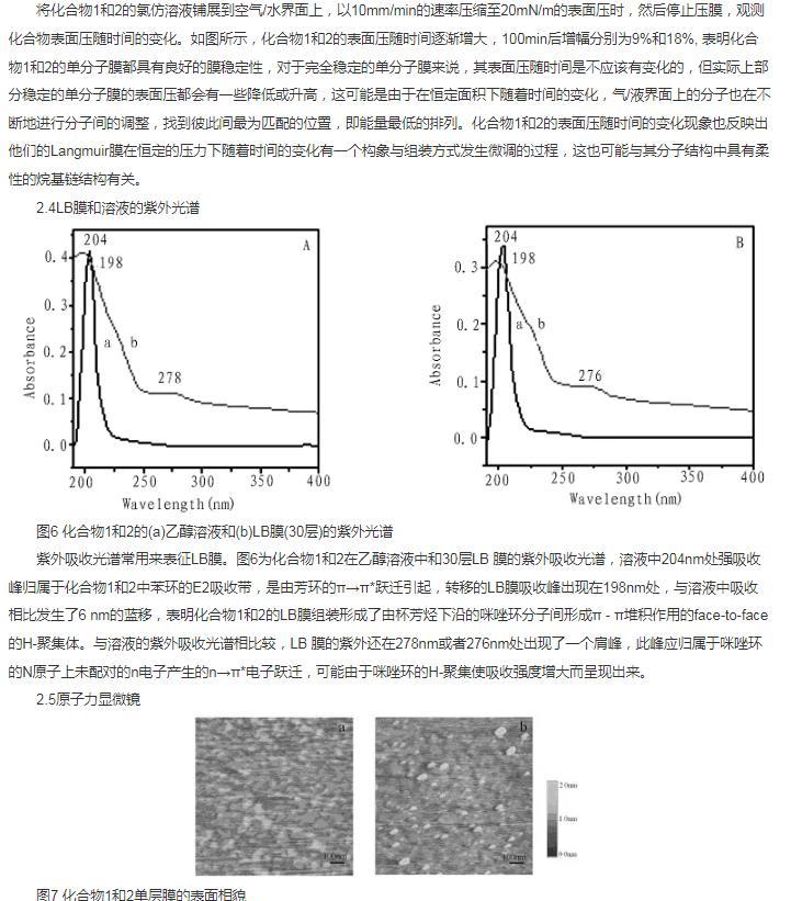 合成了雙頭基多氟烷基兩親杯芳烴化合物1和2,并對該化合物在空氣/水相界面的成膜性能進(jìn)行了研究,利用表面壓一面積(π-A)等溫線、壓縮/擴(kuò)張循環(huán)等溫線與膜穩(wěn)曲線,紫外光譜和原子力顯微鏡對組裝的LB膜進(jìn)行了結(jié)構(gòu)表征,表明化合物1和2在空氣/水相表面均能很好的形成穩(wěn)定的Langmuir膜,取代基碳原子數(shù)的增加使得化合物2的Langmuir膜單分子面積增加,崩潰壓相應(yīng)減少,組裝的LB膜均為H-聚集體,結(jié)構(gòu)均勻,穩(wěn)定性好。