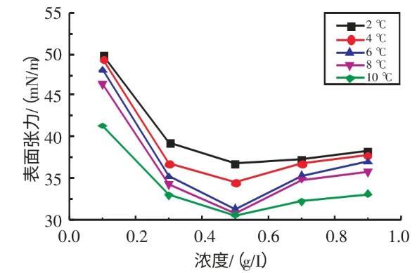 2.2.1不同溫度下十二烷基苯磺酸鈉溶液表面張力與濃度的關(guān)系實驗研究了在溫度為2、4、6、8、10℃條件下,SDBS溶液的表面張力與濃度的關(guān)系(見圖3)。由圖3可知,當(dāng)濃度在0.1~0.7 g/L時,隨著SDBS溶液濃度的升高,其表面張力逐漸減??;當(dāng)濃度在0.7~0.9 g/L時,隨著SDBS溶液濃度的升高,其表面張力逐漸增大。當(dāng)SDBS溶液濃度為0.7 g/L時,其表面張力取得最小值。