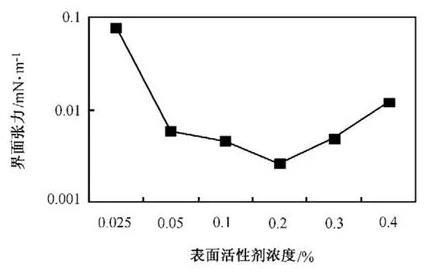 界面張力隨著表面活性劑濃度的增加先減小后略有增加。這是由于表面活性劑在濃度較低時,在油水界面上吸附的分子較少,分子排列不夠緊密且不規(guī)則,界面張力較大;濃度增大時,油水界面上吸附的分子逐漸增多,分子排列變得緊密而整齊,達到吸附飽和,界面張力急劇下降;繼續(xù)增大表面活性劑的濃度時,在油滴附近開始出現(xiàn)膠團,阻止了部分表面活性劑在油水界面的吸附,界面張力開始回升。