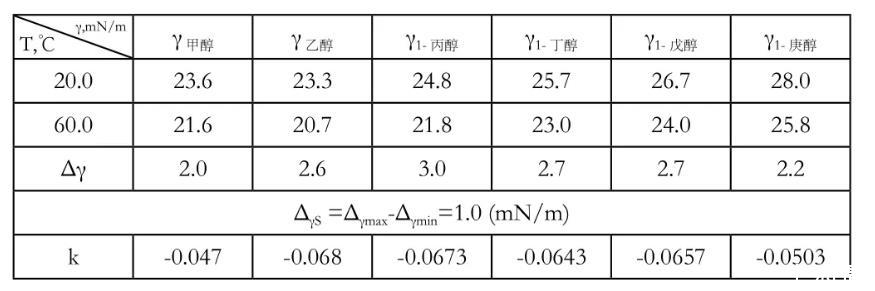 由于不同液態(tài)醇類(lèi)的液態(tài)性質(zhì)不同,其表面張力變化的程度如下表: