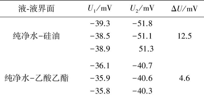 實(shí)驗(yàn)測量所用金屬吊環(huán)的外徑、內(nèi)徑分別為0.034 96 m和0.033 10 m.在20℃實(shí)驗(yàn)條件下,采用自制2種液體間界面張力的動(dòng)態(tài)實(shí)時(shí)測量儀,測量了純凈水-硅油和純凈水-乙酸乙酯間的界面張力.測量出金屬吊環(huán)由液體I中完全進(jìn)入液體Ⅱ的過程中,液體I的液膜被拉斷前電壓的最大值U1,拉斷后趨于穩(wěn)定時(shí)的電壓值為U2,數(shù)據(jù)結(jié)果如表1所示。