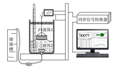 圖1為自制2種液體間界面張力的動(dòng)態(tài)實(shí)時(shí)測量裝置圖,該儀器主要包括電腦顯示器、同步信號(hào)轉(zhuǎn)換器、自制實(shí)驗(yàn)架臺(tái)、力敏傳感器、金屬吊環(huán)、恒溫杯、溫度計(jì)、排液孔、排液管、流速調(diào)節(jié)器和儲(chǔ)液槽等組成.