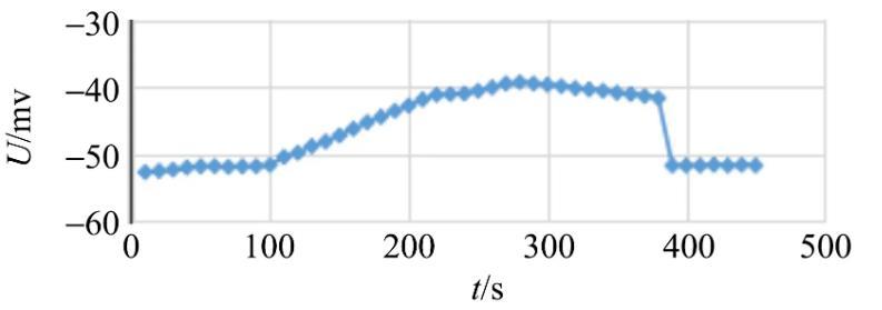實(shí)驗(yàn)過程:接通電源,將儀器預(yù)熱15min;在傳感器橫梁端頭的小鉤上掛砝碼盤并進(jìn)行定標(biāo);將金屬吊環(huán)清潔干凈,調(diào)平后掛在傳感器的小鉤上;實(shí)驗(yàn)時(shí),先將吊環(huán)置于密度較大的液體Ⅰ中,然后再注入密度較小的液體Ⅱ,調(diào)節(jié)流速調(diào)節(jié)器控制從容器底部緩慢勻速排出液體的流速,測量出電壓U隨時(shí)間t的變化曲線。圖2為純凈水和硅油的界面張力測量過程中電壓U隨時(shí)間t的變化曲線。