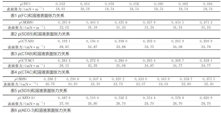 按照實驗方法Hz制備表面活性劑溶液,在室溫下,測定FC、CTAB、CTAC、SDS、SDBS和AEO-3表面活性劑的表面張力,確定CMC,結(jié)果見表1~6。