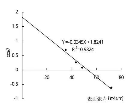 參照Zisman作圖法,選取潔凈、無病斑的劍麻葉片,用刀片切成規(guī)則平整的小塊(避開葉脈),用膠水將其固定在載玻片上,使用微量注射器分別吸取2μL已知表面張力的液體(乙二醇、DMSO、DMF和去離子水),點滴在劍麻葉片表面,置于接觸角測量儀上,記錄此時液滴所成的接觸角θ,每個處理重復(fù)10次,取平均值。以這4種液體的表面張力值為橫坐標(biāo),cosθ為縱坐標(biāo),得到一條直線回歸方程,在cosθ=1(接觸角為0)處得到相應(yīng)的表面張力值即為劍麻葉片的臨界表面張力值。